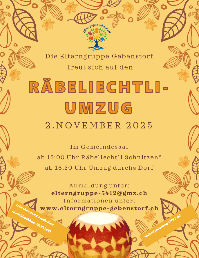 Ab 13:00 dürfen die Kinder unter der Aufsicht der Eltern an ihren Räben schnitzen (Löffel zum Aushöhlen & Rüstmesser bitte selbermitbringen) und nebenbei Lieder üben, um 16:30 Uhr ziehen wir im Umzug durchs Dorf.